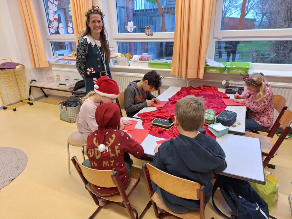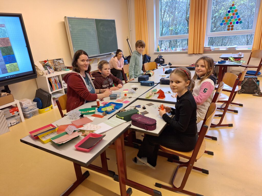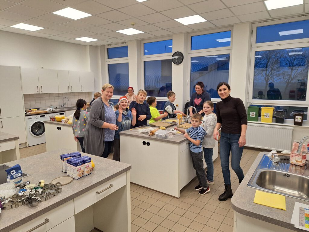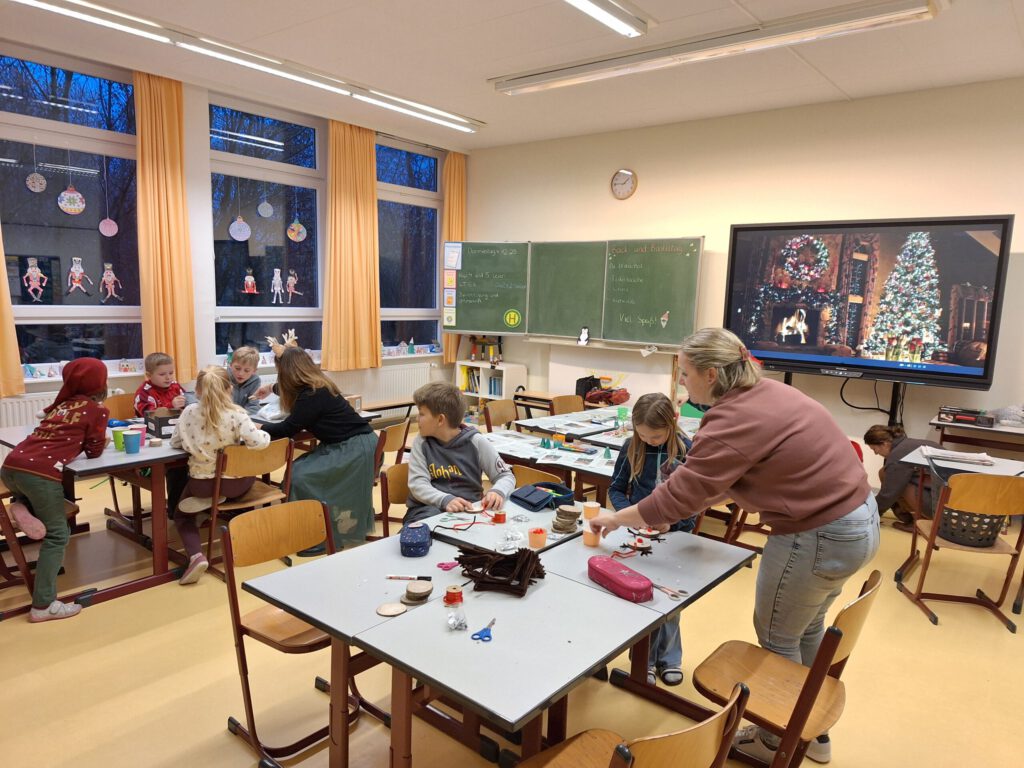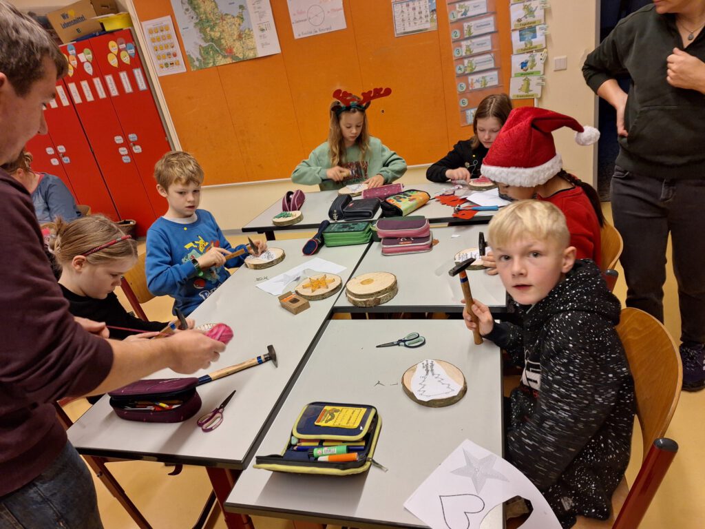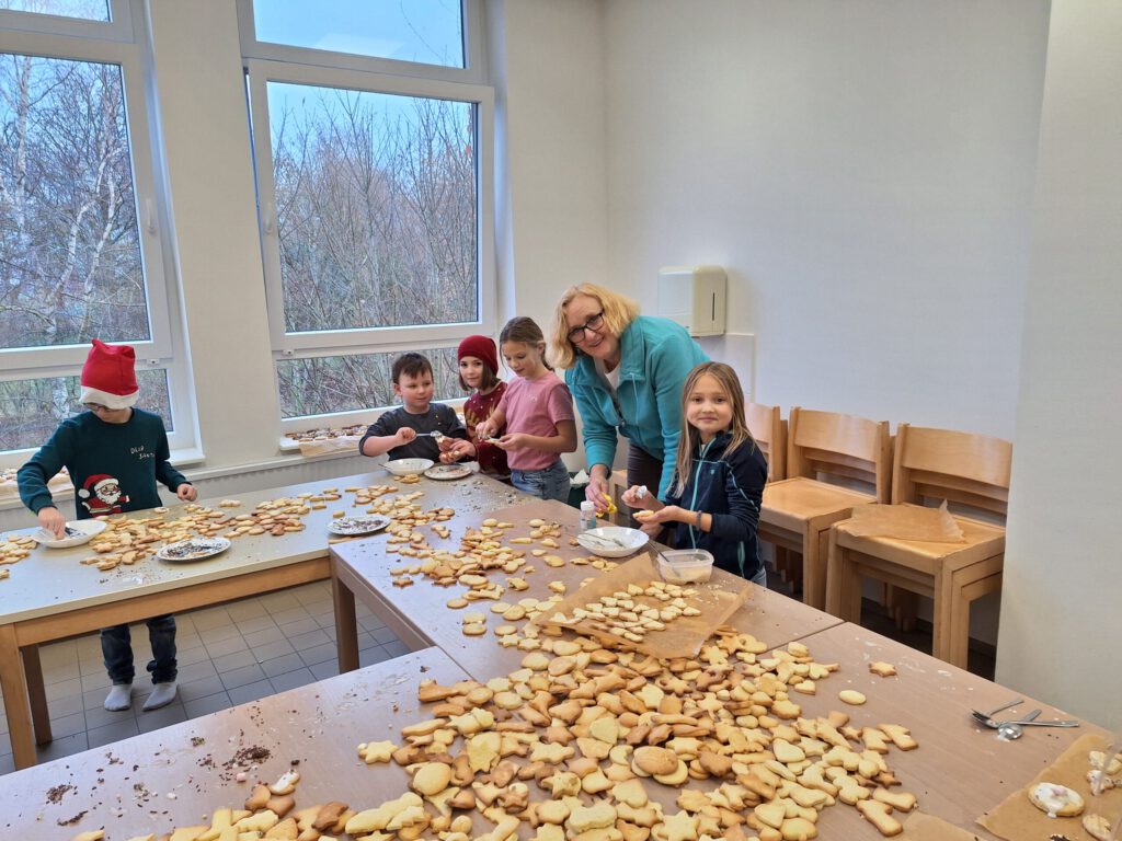 Auch in diesem Jahr brachte unser traditioneller Back- und Basteltag allen wieder viel Freude und so fand am Freitag, den 05.12.2025 in der Küche und den Grundschulklassen ein gemütliches Backen und Basteln statt. In vorweihnachtlicher Atmosphäre wurden verschiedene Kreationen gebastelt und hergestellt – unter anderem kleine Weihnachtswichtel aus Tonpapier, gefaltete und zusammengeklebte Sterne wie auch weihnachtliche Nagelbilder auf Holzscheiben. Obendrein konnten kleine Tannenbäume aus Pappe mit Wolle, aus Klopapierrollen oder aus Eierkarton sowie Rentierköpfe aus Eisstielen oder Holzscheiben hergestellt werden. Zudem war es auch mögliche kleine Engel-Teelichter zu prickeln. Die Kinder hatten viel Freude und gingen aktiv und begeistert von einem tollen Angebot zum nächsten.