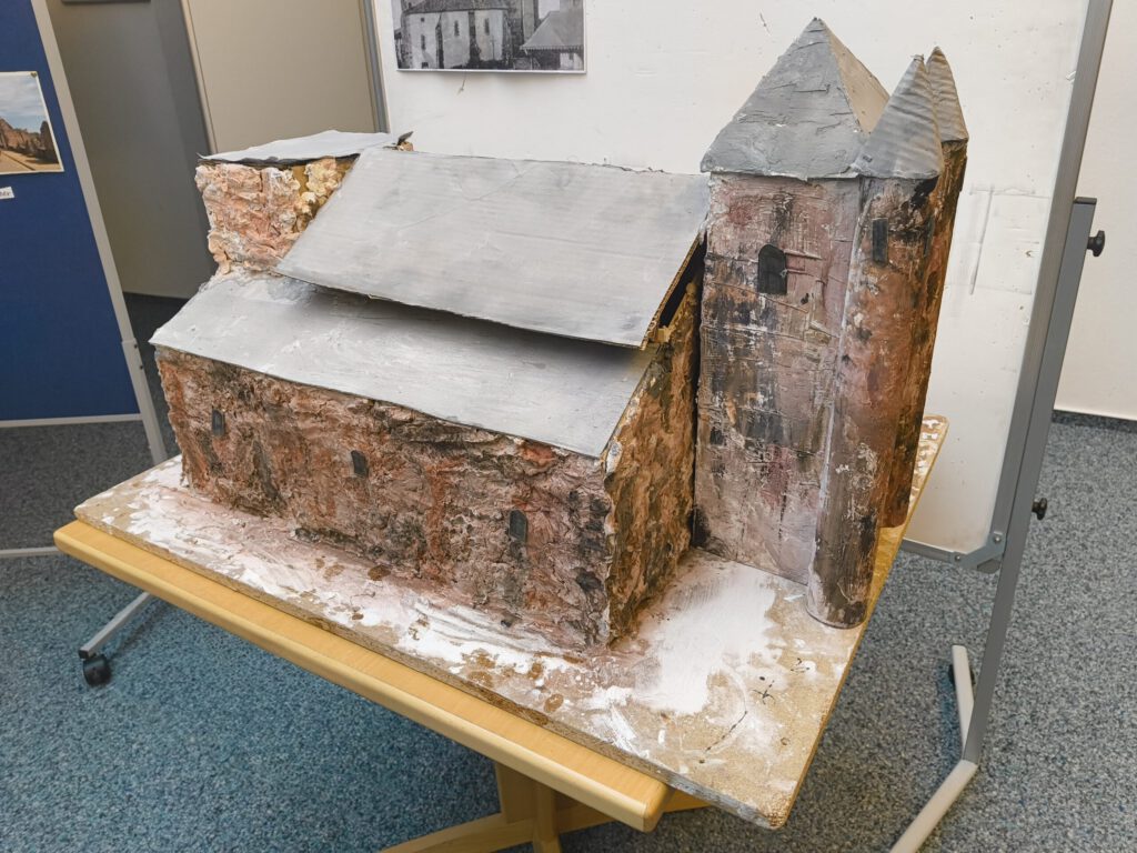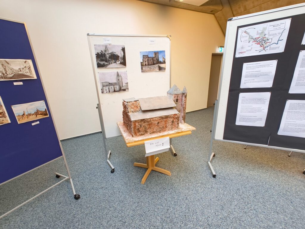 Die Ausstellung war von 10:00 bis 14:00 Uhr geöffnet und gut besucht. Unter den Gästen waren unter anderem die Schulleitung, Lehrer, Mitschüler, Familienangehörige und Bekannte, aber auch alle Interessierten, die sich mit dem Thema beschäftigen wollten. Die Ausstellung war in Form eines Halbkreises aufgebaut und zeigte Infoplakate sowie ein Ausstellungsstück, das die Kirche vor ihrer Zerstörung darstellte.