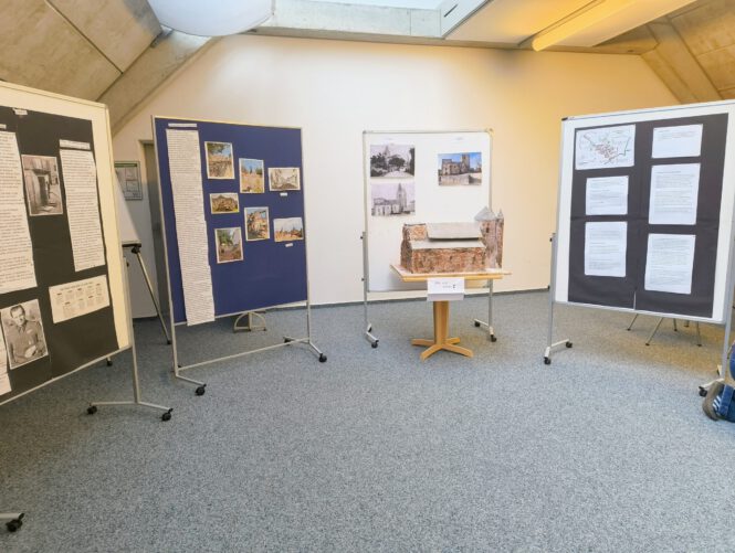 Die Ausstellung war von 10:00 bis 14:00 Uhr geöffnet und gut besucht. Unter den Gästen waren unter anderem die Schulleitung, Lehrer, Mitschüler, Familienangehörige und Bekannte, aber auch alle Interessierten, die sich mit dem Thema beschäftigen wollten. Die Ausstellung war in Form eines Halbkreises aufgebaut und zeigte Infoplakate sowie ein Ausstellungsstück, das die Kirche vor ihrer Zerstörung darstellte.