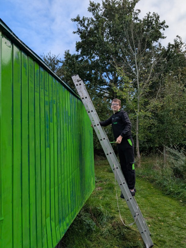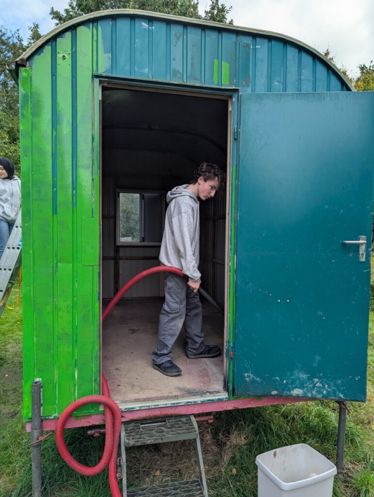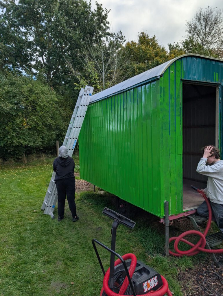 Doch auch außen tat sich einiges: Nach der ersten Lackschicht erstrahlt der Bauwagen nun in einem frischen, satten Grün, das nicht nur ins Biotop passt, sondern auch Symbol für Neuanfang und Wachstum ist.