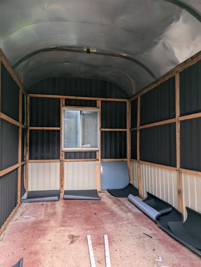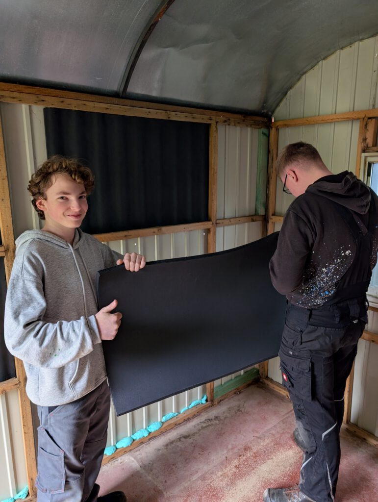 Im Inneren des Wagens wurden zunächst die letzten alten Latten entfernt und durch neue ersetzt. Anschließend stand eine gründliche Reinigung des gesamten Innenraums an, um eine saubere Basis für den nächsten Arbeitsschritt zu schaffen: das Verkleben der bestellten Dämmung. So entsteht nach und nach ein geschützter, gut isolierter Raum, in dem sich Schülerinnen und Schüler künftig wohlfühlen können.